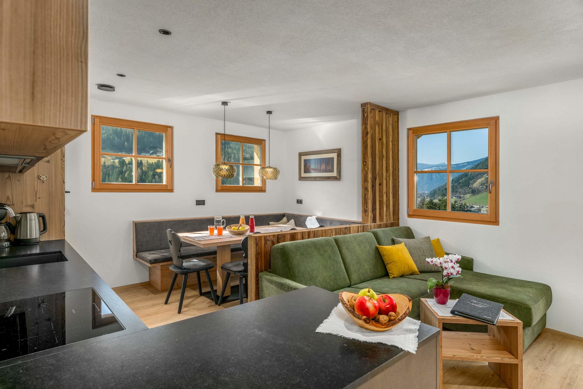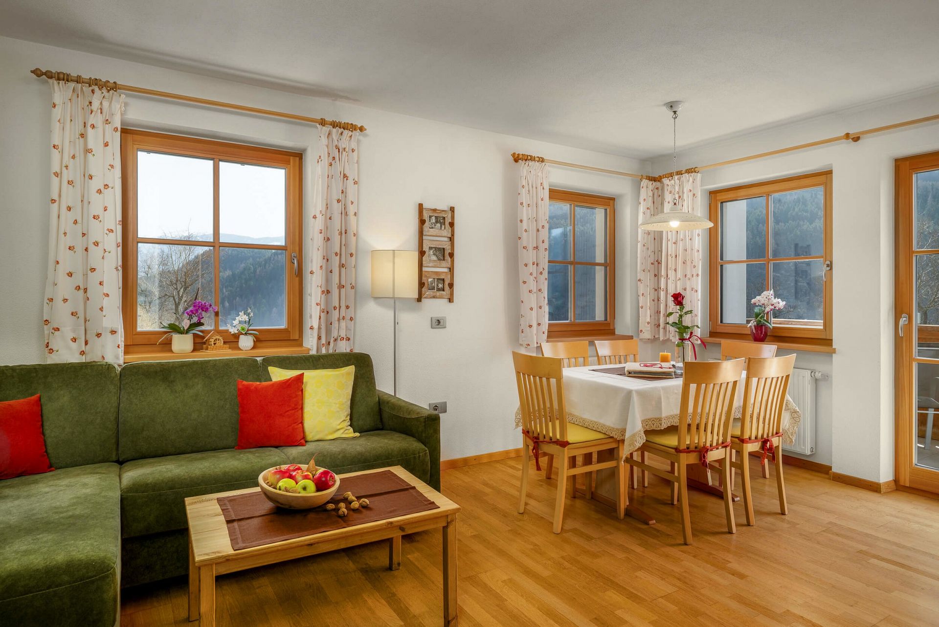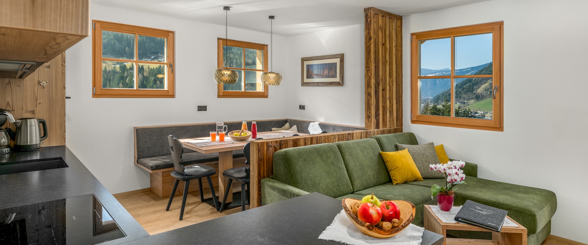 Die drei Ferienwohnungen auf unserem Hof sind wunderbare Rückzugsorte, um einen fantastischen Familienurlaub in den Bergen zu verbringen. Zwischen zwei bis acht Gäste können sich hier häuslich einrichten. Das warme Wohnambiente, die liebevolle Einrichtung und der moderne Komfort sind Garanten für unbeschwerte Tage in Kiens / Südtirol. In der nur zwei Kilometer entfernten Ortschaft Kiens können Sie sich mit all dem eindecken, was Sie zum Kochen brauchen – unsere frischen hofeigenen Produkte komplementieren das Kulinariksortiment.